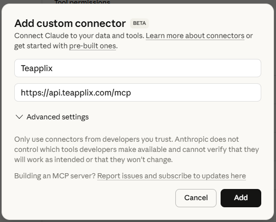 No need to fill the advanced section, click on Add. Now you have added Teapplix MCP to your claude account. You can start asking questions and perform operations.